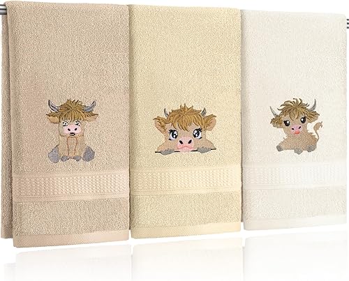 3 Pcs Highland Cow Hand Towels Embroidered Cow Farmhouse Decorative Bath Towels for Bathroom Kitchen Decor Country Farm Highland Holiday Housewarming Gifts, 100% Cotton, 13.3 x 29.5''