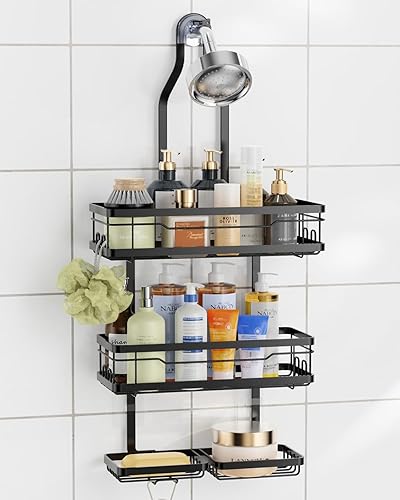 OMAIRA Shower Caddy Hanging with Soap Scrub Holder, Stainless Steel Adjustable No Drilling Non-Slip Large Capacity Sturdy Over Shower Head Shower Organizer Inside Shelves Bathroom Storage Rack, Black