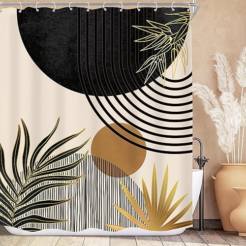 KOMLLEX Mid Century Green Boho Shower Curtain, Abstract Modern Shower Curtains for Bathroom, Plant Botanical Minimalist Leaf Arch Sun Fabric Liner Waterproof Polyester 12 Pack Hooks 60Wx72L Inches
