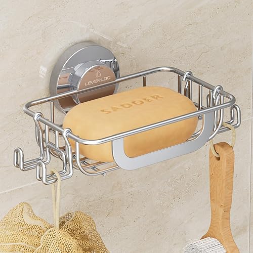 LEVERLOC Soap Holder Dish with Hooks for Shower, Bar Suction Cup Soap Tray Wall Mounted, Rustproof Stainless Steel Sponge Holder Caddy for Bathroom Bathtub Kitchen Sink, Black