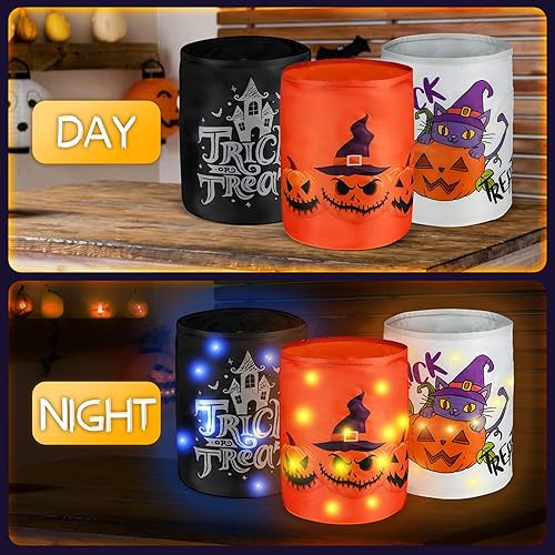 ATFUNSHOP Halloween Trick or Treat Bags with LED Lights - 3 PCS13x10 Inch Glow in the Dark Pumpkin Buckets for Kids, Reusable Baskets for Halloween Party Favors & Birthday Goody Candy Bags