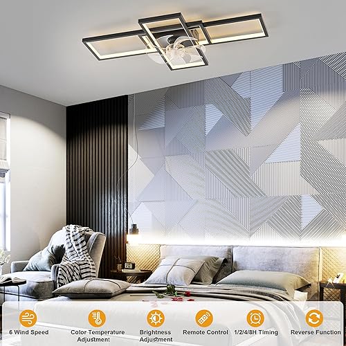 GEADI Modern Ceiling Fan with Light,35" Dimmable Flush Mount Ceiling Fans with Lights and Remote, Black Led Fandelier,Low Profile Ceiling Fan for Bedroom,Kitchen,Living Room(6-Speed,Timing,3000-6000k