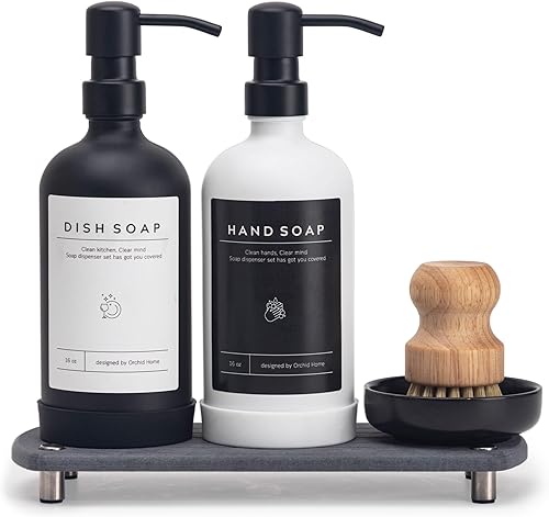 LUXURY SOAP DISPENSER SET: Elevate the look and feel of your kitchen or bathroom with our luxurious kitchen soap dispenser set. This set includes two amber glass bottles with sleek black stainless steel pump heads, two black silicone bottom anti-slip pads, a dish brush, a brush holder, and a quick-drying diatomaceous earth tray. Experience a modern and elegant upgrade with this stylish set for your daily soap needs