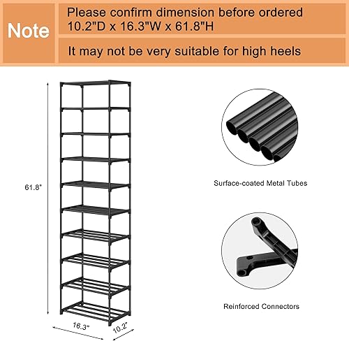 10 Tier Tall Shoe Rack, Narrow Lightweight Shoe Shelf, Compact Vertical Shoe Stand, Small Space Saving for Closet Floor, Dorm Storage Organizer, Front Door Entrance, Entryway