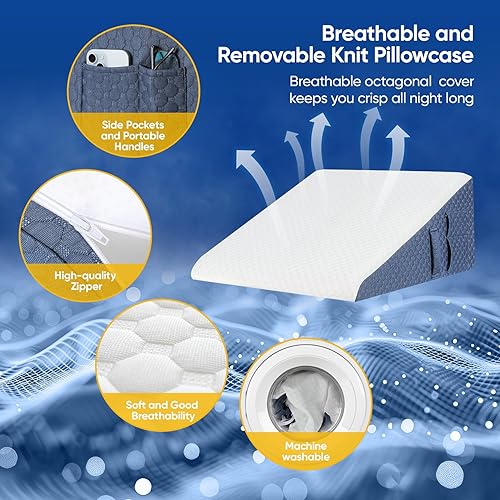 MACHINE WASHABLE KNIT PILLOWCASE: Our triangle bed wedge pillow comes with a hotel-grade air-layered knit fabric pillowcase that is not only soft and breathable but also easy to remove and machine washable. With a convenient side zipper design, maintaining cleanliness and freshness is a breeze. The non-slip PVC particles on the bottom ensure that the foam wedge pillow stays in place, providing unparalleled comfort.