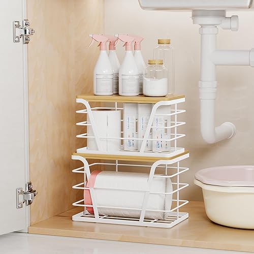 Thoughtful Design:The large garbage bag holder’s bamboo cover to hold smaller units in place, creating a sturdy under sink organizer tower. Perfect for laundry storage rooms,kitchen storage organization and kitchen towel storage