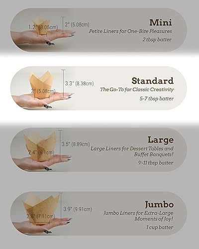 Size/Color: Package includes 200 unbleached pieces of tulip cupcake liners in total. The bottom diameter of these cupcake cups is 1.97 inches (5 cm), fitting standard muffin or cupcake pan. The depth is 2.2 inches (5.5 cm) at the low point and 3.15 inches (8 cm) at the high point with a capacity of 3 oz.