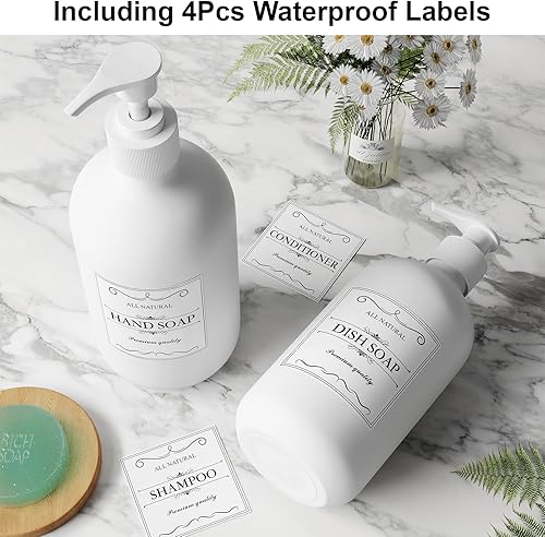 【2 Pack Dispensers & 4pcs Labels】Each package includes two soap dispensers and four waterproof labels. With a size of 8" x 2.9" and a capacity of 16 ounces, these bottles hold an ample amount of liquid soap