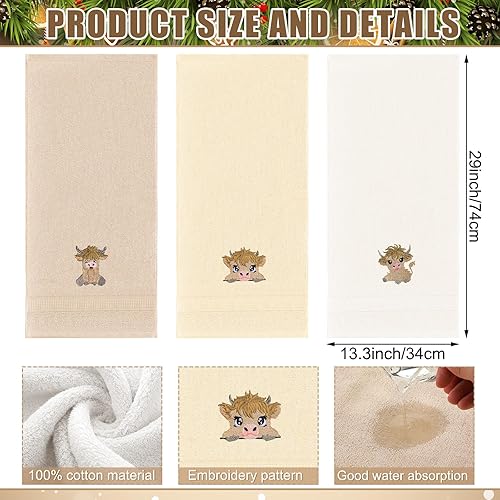 3 Pcs Highland Cow Hand Towels Embroidered Cow Farmhouse Decorative Bath Towels for Bathroom Kitchen Decor Country Farm Highland Holiday Housewarming Gifts, 100% Cotton, 13.3 x 29.5''(Beige,Calf)