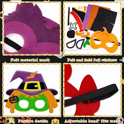 30PCS Halloween Felt Mask DIY Kit: This complete set includes 30 pre-cut felt masks with pre-attached elastic cords in 15 unique Halloween designs (2 of each style), 6 sheets of felt stickers, 6 sheets of gold foil stickers - everything ready for spooky crafting fun