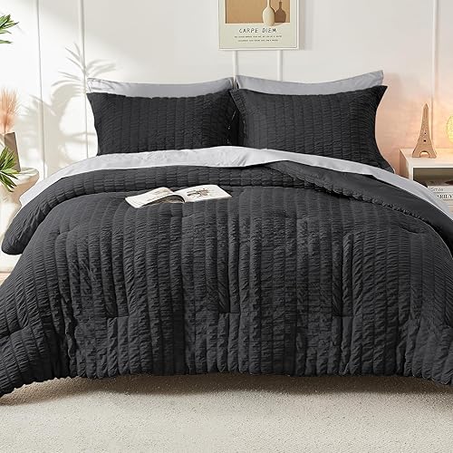 HYMOKEGE Queen Comforter Set Seersucker 7 Pieces, All Season Luxury Bed in a Bag for Bedroom, Bedding Set with Comforters, Sheets, Pillowcases & Shams, Dark Grey(Black/Light Grey,Full(82"x86"))