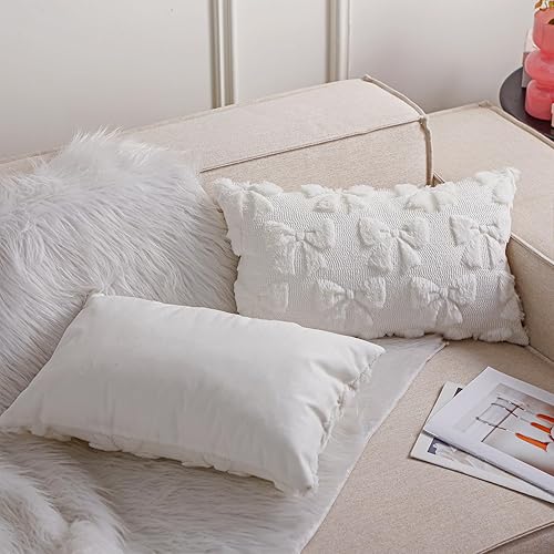 Mixweer Bow Pillow Covers Set of 2 Coquette Room Decor Cute Faux Fur Soft Bowknot Preppy Stuff Fluffy Plush Aesthetic Pillow Covers for Bed Sofa Couch, Fall Christmas Decor (18 x 18 Inch,Pink)(Cream White,11.8" x 10.2" (Pack of 2))
