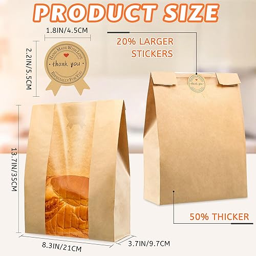 50% THICKER:The perfect large bread bag measures 13.7*8.3*3.7in, 50 pieces, weighs about 22.7 ounces, and is 50% thicker than ordinary bakery bags, making it stronger, more tear-resistant and more durable. Each pack comes with 60 super cute seal label stickers with a tie. They are 20% larger than regular stickers.