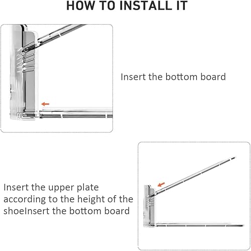 Easy to assemble:This shoe storage is composed of one adjusting baffle and two identical supporting plates, which only need to be inserted into the baffle's hole to install it successfully. the shoe holder has double baffles for effective anti-slip,small stopper can catch the heels of high heels and such; large stopper can catch board shoes, sports shoes, etc