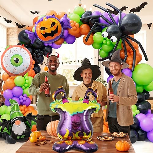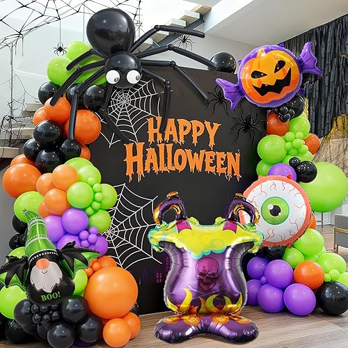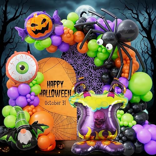 Includes three main festive colors — black, green, and orange — in 18", 10", and 5" sizes to create a vibrant layered balloon garland or spooky backdrop. Comes with:18" balloons: black, green, orange (1 each), 10" balloons: black (20), green (20), orange (20), purple (10), 5" balloons: black (15), green (15), orange (15), purple (10), 1x Pumpkin Candy, 1x Green Bat Fairy Decoration, 1x Orange Eye Prop, 1x furnace, 1pcs white ribbon, 1pcs 100 glue dots, 1pcs balloon arch strip