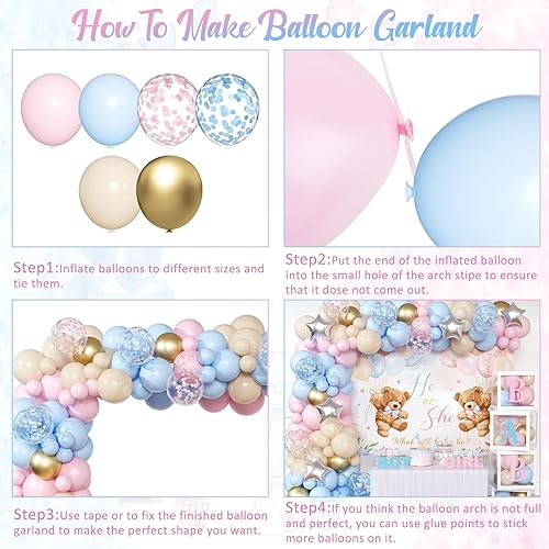 [ Unique Bear Gender Reveal Ideas ] - We have carefully designed just the right color combination for this set of baby gender reveal party supplies. Blue, pink, and nude balloons fit the gender reveal theme perfectly. You can put the balloons in a transparent baby box with pink and blue letters, then use the remaining balloons to build a beautiful gender reveal balloon arch, paired with cute bear gender reveal background, these decorations add a great atmosphere to your gender reveal party.
