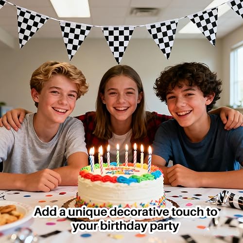 Versatile Usage: Perfect for race car birthday party decorations, sports events, outdoor picnics, and more. These black and white racing flags can be easily hung on walls, trees, fences, or porches, adding a festive atmosphere to any gathering