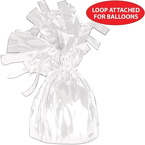 WHITE BALLOON WEIGHTS: Includes 6 individual balloon weights wrapped in shiny white metallic foil with a matching ribbon loop, offering both function and decorative style for your balloon arrangements