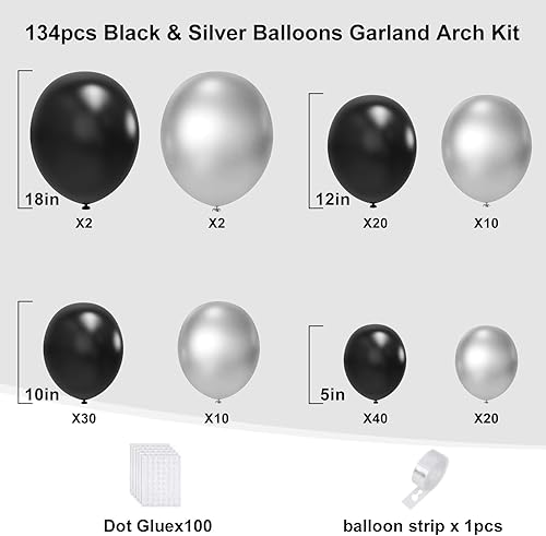 【Different Size Black Gold Balloons Arch Kit】 The black gold balloon garland arch kit includes 134pcs different sizes of black balloons (18in*2, 12in*20, 10in*30, 5in*40), gold balloons (18in*2, 12in*10, 10in*10, 5in*20), a roll of 16ft garland strip and glue dot, which is the must-have to create an atmospherearties.