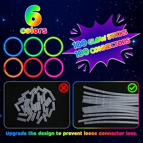 【 Package Included 】:100 glow sticks (in six colors) and 100 connectors. Use one connector to create a bracelet, and three connectors to create a necklace. You can also use them as party decorations and freely combine them for decoration.