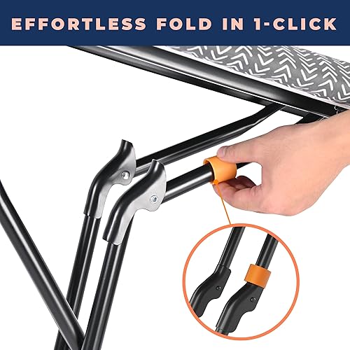 PERFECT IRONING EXPERIENCE: HEAVY DUTY STEEL frame with strong, durable and long-lasting connections provide perfect stability. You achieve perfect and wrinkle free clothes in a fraction of time with the help of non-slip feet and locked feet design. The storage lock keeps it closed safely so it will not open accidentally.