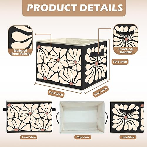 Boho Neutral Beige and Black Floral Storage Bins, 70s Retro Groovy Flower Botanical Collapsible Storage Box Laundry Basket with Handle for Home Bedroom Bathroom Office Clothes Toys Books