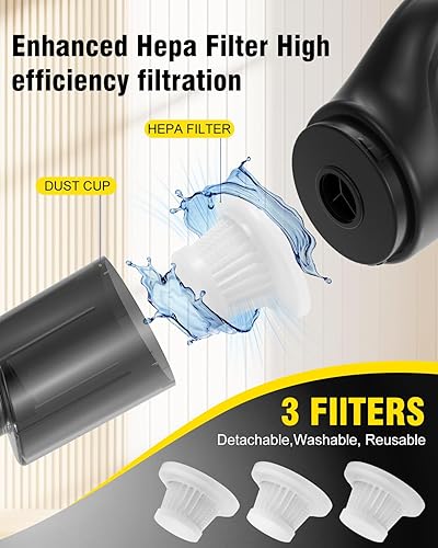 【3 HIGH QUALITYHEPA FILTERS】:: Our handheld car vacuum cordless comes equipped HEPA filter, not only capable of filtering out most of tiny particles,but also protect the motor from damage and extends the small vacuum cleaner's lifespan.(Use tips: If the hand held vacuum for car filter is full of dusts or insufficient suction, please clean the dusts in the filter. To ensure that the dusts collector can work normally)