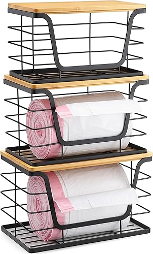ALOCEO 2 Pack Storage Stackable Kitchen Laundry Organizers with Bamboo Top, Large Trash Bag Holder and Small Garbage Bag Dispenser for Countertop Organization