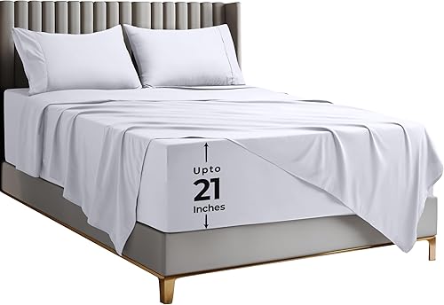 Deep Pocket Fit: Designed to fit taller mattresses up to 21 inches or those with plush toppers, the fitted sheet slips on easily and stays in place with an all-around elastic, keeping your bed smooth and secure.