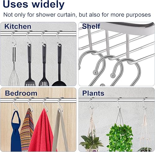 【WIDE RANGE OF USES】shower hooks are not only suitable for shower curtains, but also for hanging towels, pots and pans, coffee cups, clothes, and plants in bathrooms, kitchens, bedrooms, offices and gardens.