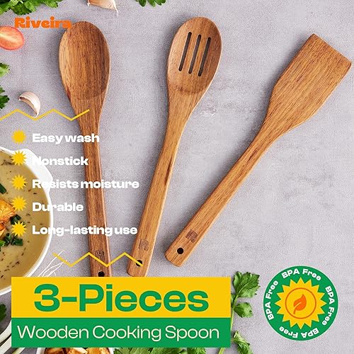 Riveira Bamboo Cooking Spoons 6-Piece – Wooden Cooking Utensils Set with Wooden Spoons for Cooking & Spatulas Wooden Utensil Sets – Premium Kitchen Utensils Set – Durable First Apartment Essentials(Teak,Set of 3)