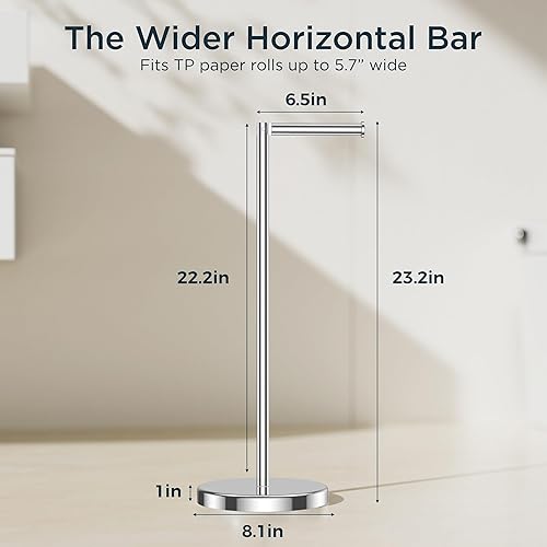 Fit Most Roll of Paper: The 6.5-inch horizontal bar fits most of roll sizes such as regular, mega, and jumbo, catering to your household's diverse needs. The height is 23.2 inches and provides ample height for easy reach. Dimension: 23.2 x 8.1x 6.5 Inch
