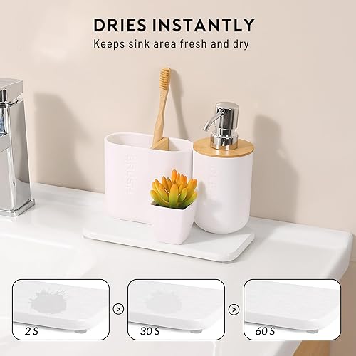 Versatile Use — This water absorbing stone tray works well for bathroom sinks, kitchen counters, and more. It doubles as an absorbent pad for soaps, cups, hand soap bottles, sponges, makeup bottles, etc. Keep your sink or countertop dry and clean with our trays, for a neater, more organized life.