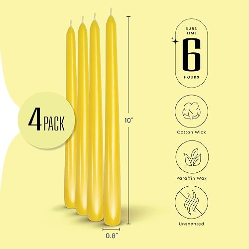 Leor & Lair Black Taper Candles - 4 Pack 10" Black Candlesticks - Unscented Long Burning Halloween Candles for Halloween Decoration, Gothic Decor, Holidays, Weddings & Restaurants(Yellow)