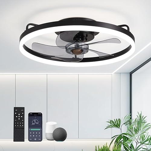 Ceiling Fans with Lights, Flush Mount Ceiling Fan with Lights and Remote, 6 Wind Speeds Low Profile Ceiling Fan for Bedroom, Kids Room and Kitchen 20" (Black)(Black-360° Rotating-LL-6001BL-03)