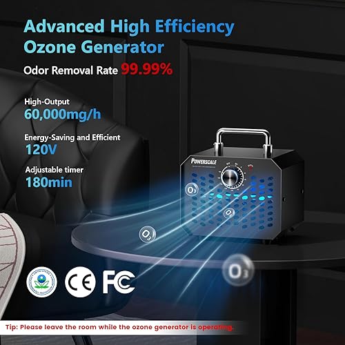 Powerscale Ozone Generator 60,000 mg/h, Compact, 10s Safety Evacuation, Precision Electronic Control, O3 Odor Eliminator for Home, Car, Pet Smell, and Basement up to 2600 Sq.Ft - OZA1, Black
