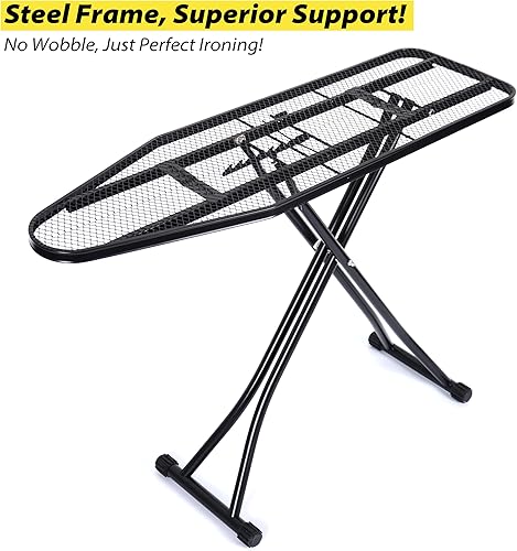 Sturdy Construction: Our ironing board is built with a heavy-duty steel frame that ensures maximum stability and durability. This design prevents wobbling and tipping during use, allowing you to tackle even the toughest wrinkles with ease.