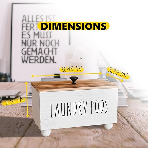 PERFECT SIZE --- If you need a laundry pods holder that will hold up under any conditions, look no further. This storage box is made of sturdy wood and is spacious enough with 9.45(L)X5.12(W)X5.91(H) inch size dimensions. Container will hold 70+ pods!