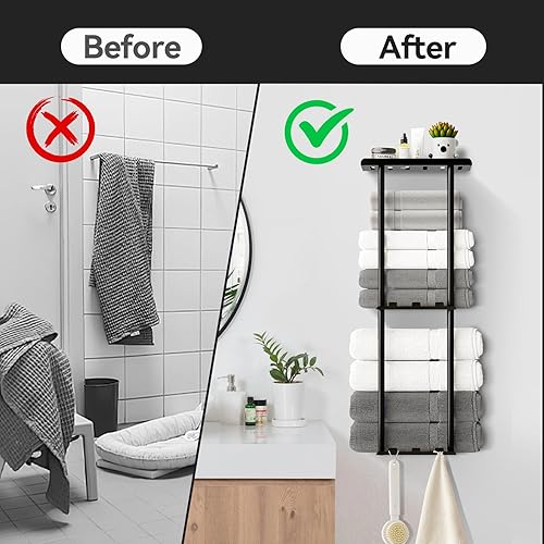 Comment on "Towel Racks for Bathroom, 3 Tier Metal Towel Holder, with Shelf & 6 Hooks, 29 inch Wall Mounted Towel Storage, 6 Large Bath Towels Capacity,Small Bathroom Towel Rack for Rolled Towels, Black(Black,29.1 in/3 Tier)"
