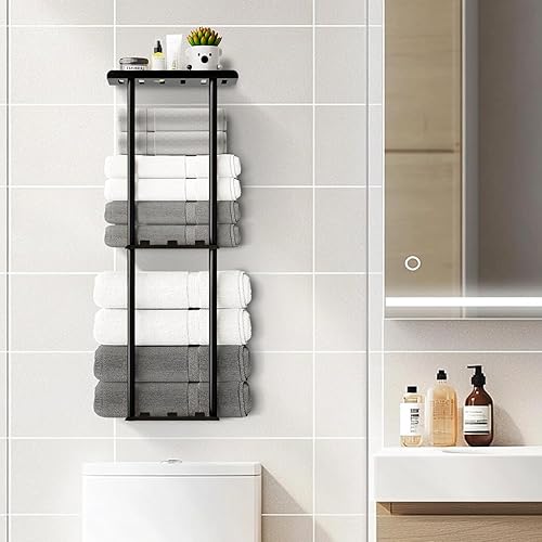 Efficient 3-Tier Bathroom Towel Rack with Shelf:This wall-mounted towel rack features a 3-tier design with a sturdy metal shelf, perfect for organizing rolled towels, bath towels, and hand towels neatly. The top shelf provides extra space for toiletries or decor, making it ideal for small bathrooms, RVs, and apartments.