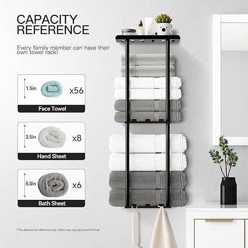 Large Capacity Towel Organizer for Bathroom Wall:Holds up to 6 bath towels (63" x 40"), 8 hand towels (40" x 20"), or 56 washcloths (12" x 12"). The space-saving vertical design maximizes storage, perfect for bathroom towel storage and towel organization.