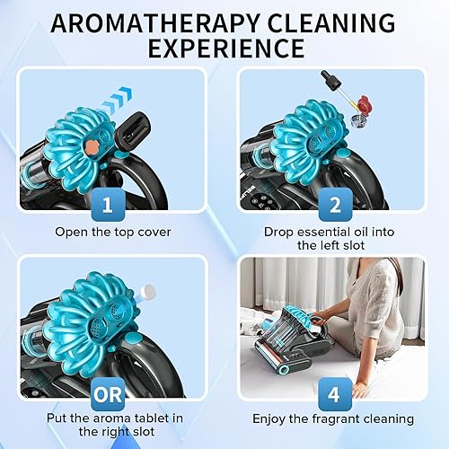 • Features dual fragrance slots: essential oil on the left, aroma tablets on the right (3 tablets included). Enjoy a refreshing ambiance while cleaning, transforming chores into a sensory delight