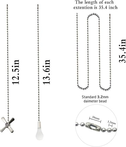What you get: includeing 2 pieces 12 inchs light bulb shaped & 2 pieces 12 inchs fan shaped pull chains , 2 piece 35.4 inches bead pull chain and 4 pieces extra connectors (Just as image shows).