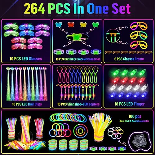 • 264 PCS Glow Party Supplies:Our glow in the dark party supplies rich variety, includes 10 PCS Led glasses, 100 PCS glow sticks and 100 normal connectors, 18 PCS finger lights, 10 PCS rocket copters slingshot led helicopters, 10 PCS butterfly bracelet connectors, 10 PCS LED hair clips fiber optic, 6 PCS glow glasses molds, bright colors and flashing lights glow party favors for neon glow party supplies and neon party favors