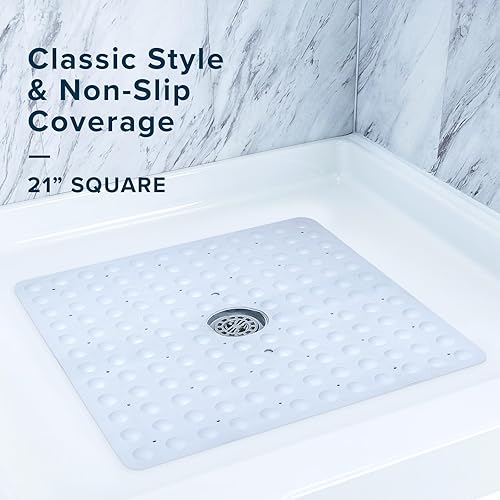 SlipX Solutions Square Natural Rubber Shower Stall Mat, 21” x 21”, Non Slip Safety, Built-in Product Protection, 140 Power Grip Suction Cups, Center Drain Hole, White(White)