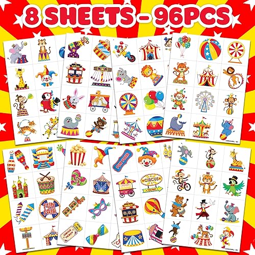 Package Includes: 8 Sheets Carnival Circus Clown Animal Popcorn Pre-Cut temporary tattoo, total 96 PCS different designs tattoos