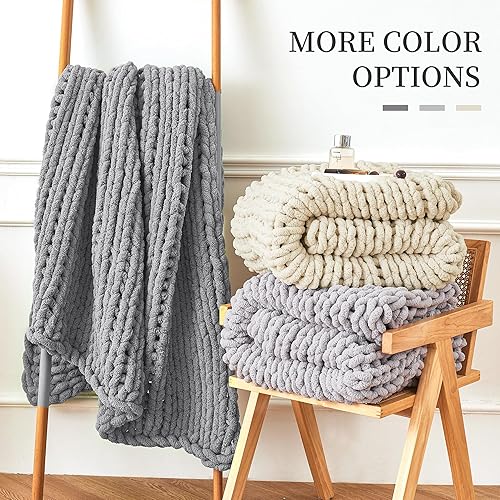 Admitrack Chunky Knit Blanket Throw 51"x63", 100% Hand Knit Chenille Throw Blanket for Sofa & Home Decor, Soft and Cozy Knitted Throw Blankets (Ivory,51"x63")(Dark Gray,51"×63")
