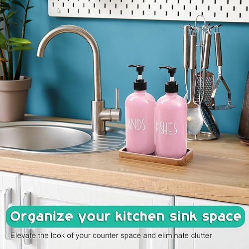 ALELION Glass Dish Soap Dispenser for Kitchen - 16 OZ Hand Soap Dispenser Set with Pump and Acacia Wood Tray - Black White Modern Farmhouse Kitchen Bathroom Decor and Accessories(Pink)