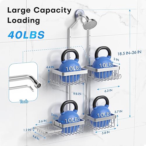 [Aluminum Alloy&Strong Load Bearing] - Hanging shower rack made from durable premium alminum alloy,shower caddy is not prone to rust,deformation,or breakage,and has a strong weight-bearing capacity of up to 40 pounds.You can store shampoo,conditioner,body wash,soap,cup,and other shower essentials.silver shower caddy maximizes the use of your bathroom,shower room,or bathtub space.