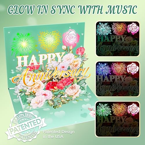 【Pop Up LIGHTS&MUSIC Anniversary Card】Celebrate your anniversary with a romantic card. When you open the card, the 3D flowers pop out from the center while colorful fireworks lights glow in sync with music. Make your anniversary is a truly memorable day!